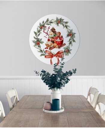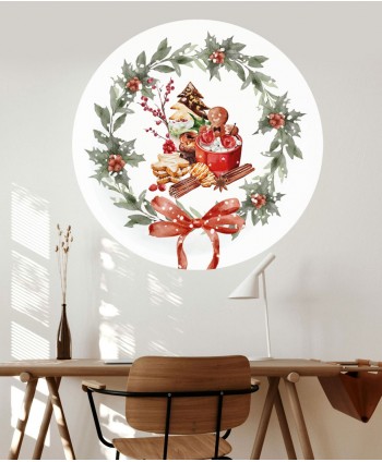 Nowa wyjątkowa, limitowana kolekcja świątecznych naklejek samoprzylepnych na ścianę, w kształcie koła o średnicy 100 cm. Świąteczny wianek - bajeczna, ilustrowana kompozycja otoczona jemiołą, w której centrum znajdują się świąteczne słodkości: piernikowy ludzik, cynamon i gorące kakao. . Podana cena jest za naklejkę o średnicy 100 cm.